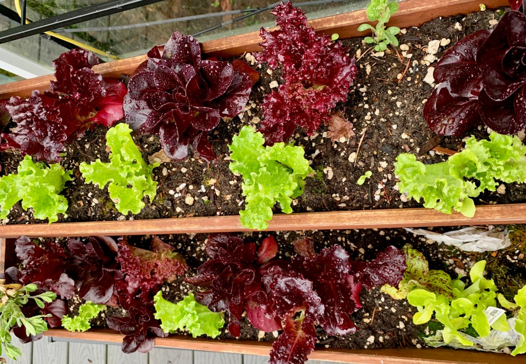Lettuces and kale are among the easiest things to grow here in the PNW. For the past several years, I have kept two 2 foot long planter boxes of different types of leaf lettuces. Last year was the first time I collected seeds from two of my favorites, a light green curly leaf variety and a spotted leaf one. Each year, including this one, I started with young plants from Wilco. I have learned that these lettuces bolt (produce flowers) quickly if you don’t harvest individual leaves regularly, so it is good to have replacement plants, when the first round goes to seed. I should have plenty of new lettuces ready when the time comes!