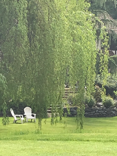A large weeping willow tree with a pair of Adirondack chairs set underneath, overlooked the brilliantly green grassy hills.