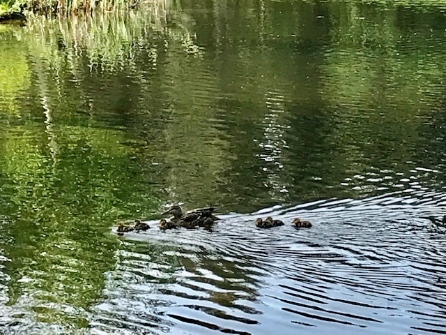 They were interrupted by an occasional ripple from mother ducks swimming with their baby ducklings trailing behind them.