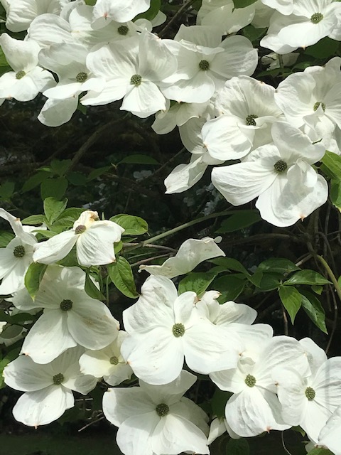 Bunnies scampered across the greens to hide in the bushes. Small black birds were resting on top of the cattails. As we approached, they took flight revealing a brilliant red under their wings. We admired the stately homes surrounded by flowering bushes. They were filled with colors of purple blues, deep reds, pinks, yellow oranges and an occasional white dogwood in full bloom.