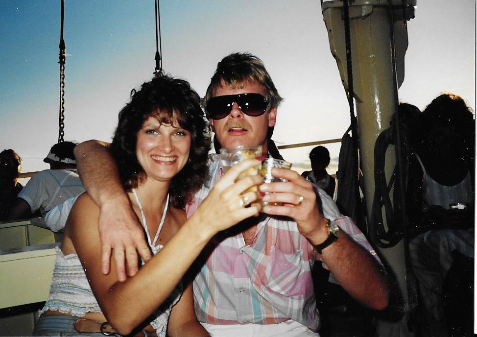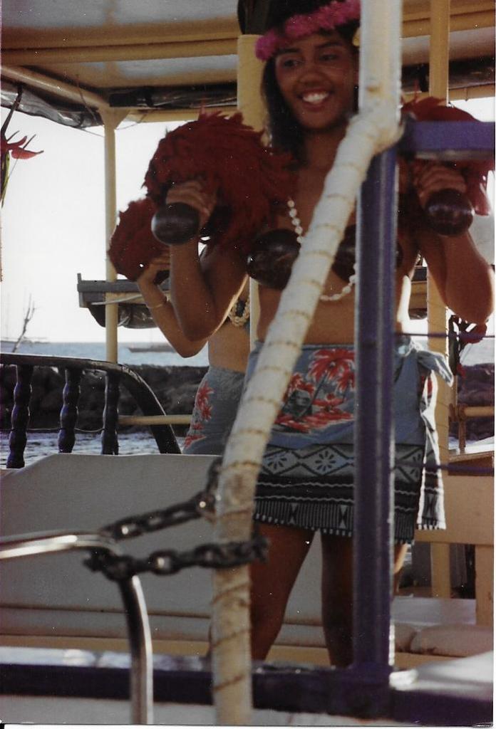 Once it was dark, they herded us downstairs for the floor show. We sat around on some folding chairs and watched a “Don Ho” type singer do his lounge act. Robert was happy when the coconut girls showed up to dance the hula. The singer kept trying to get people to come up and dance with the girls. “Anyone here celebrating an anniversary?” he would say. “Let’s all give the Smiths from Iowa a round of applause. Come on up here and dance the hula!” When he asked about honeymooners, Robert shook his head and gave me dagger eyes. There was no way he was going to dance the hula! Besides, we were pretty drunk by now and really needed to get off the boat.