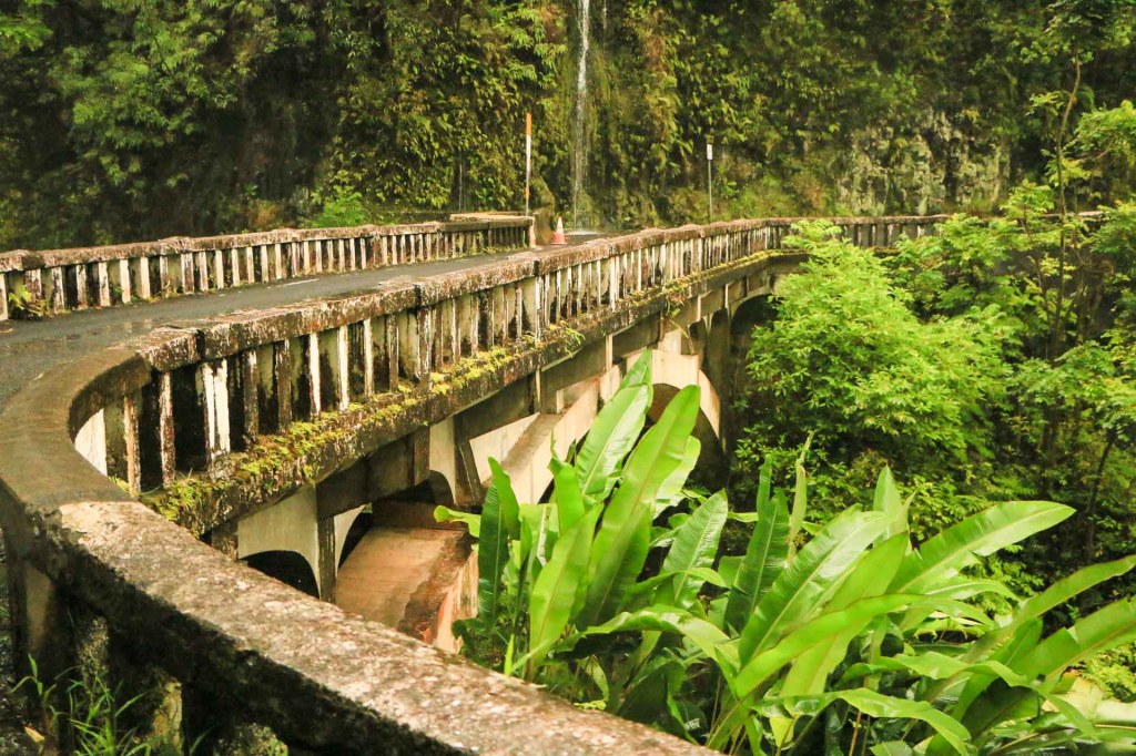 When we reached the bottom, there was the sign for the Road to Hanna. We turned off to the right and followed the signs to the famous highway. The Hana Road was completed in 1926. It has 617 hairpin curves, 59 one-lane bridges and at least as many waterfalls. The speed limit is 25 MPH, and it takes 2.5 hours to get to Hana on a good day. It took us about 6 hours to make the roundtrip.